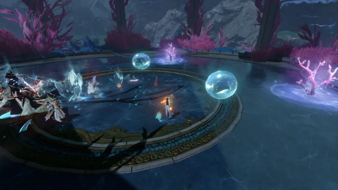 4、排浪阶段,所有人提前回在中间方便排浪,被点名玩家按照箭头方向跑到场地边缘开解控排浪即可,实在躲不过去的可以用流月无痕等无敌技能躲避。